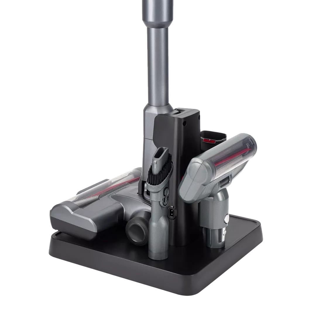 - Вертикальная парковка; Индикатор заполнения пылесборника; Контейнер для насадок; Регулировка мощности; Съемный ручной пылесос