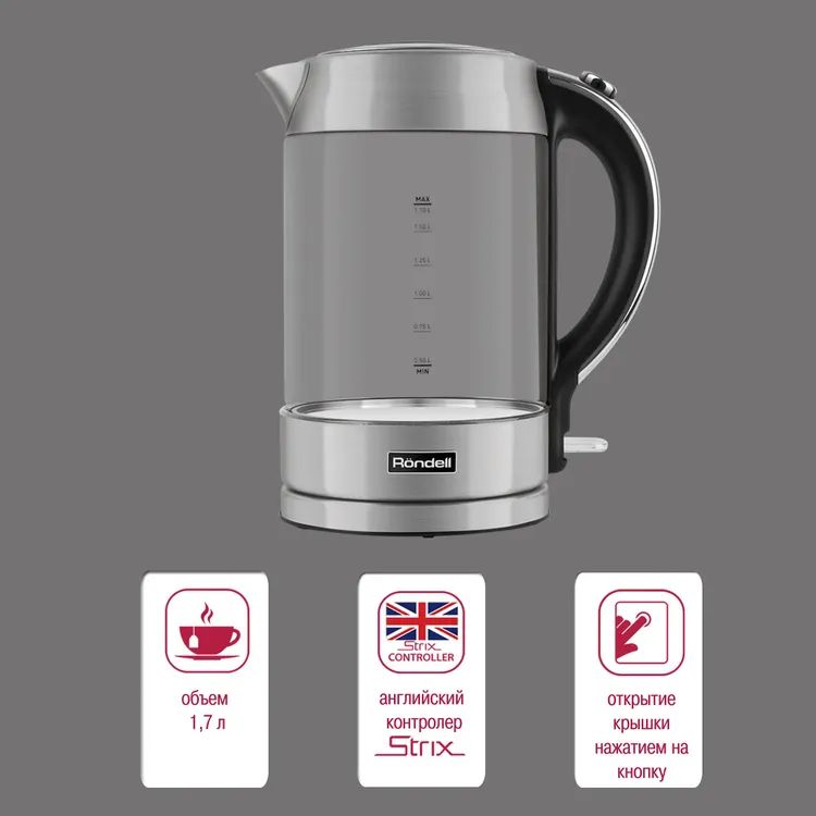 Чайник электрический Rondell 1001-RE-01 1.7л. 2200Вт серебристый (корпус: стекло)