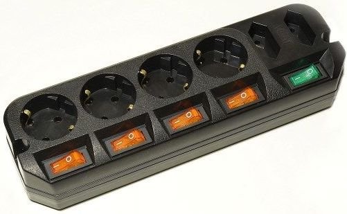 - сетевой удлинитель, 6 розеток: 4 евро и 2 узкие, индивидуальные выключатели, максимальная нагрузка: 2200 Вт, возможность крепления, шнур 5м